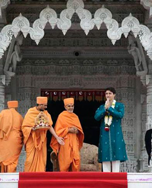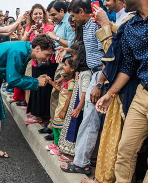 Canada's Prime Minister Justin Trudeau greets people as he visits the BAPS Shri Swaminarayan Mandir to celebrate the 10th anniversary of the Hindu temple in Mississauga, Ontario