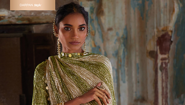 Flowy crinkled metallics, intricate zardozi, and mirrorwork set a dreamy, almost surreal tone for Etasha by Asha Jain’s latest collection, Banno.